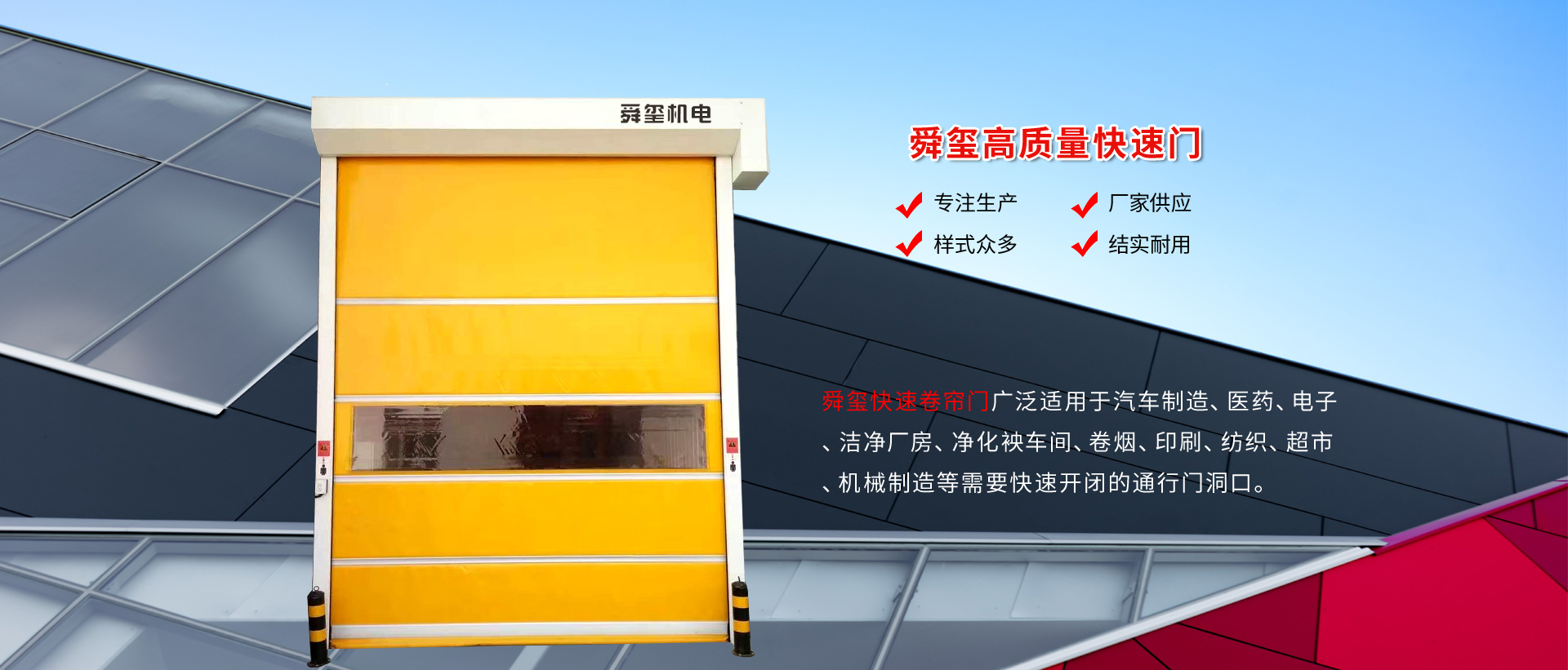 河北舜璽機電設備有限公司主要產品快速卷簾門、快速堆積門、硬質螺旋快速門、雙層柔性機庫門、工業提升門、上滑道車庫門、汽車4S店透視門、卸貨平臺、工業門封、大型工業電扇等各類相關電動門、自動門和物流設備。